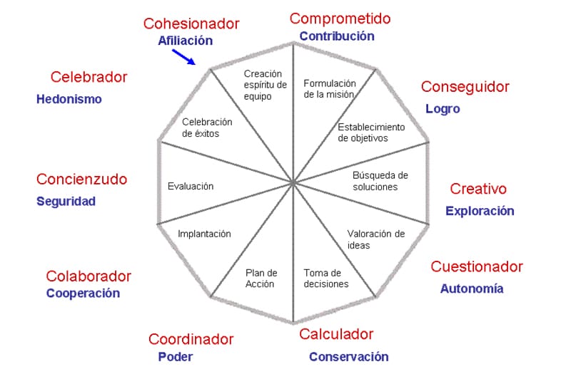 Como ya vimos en el artículo Innovación y compromiso en equipos diversos, la rueda de motivos nos permite conocer los diversos roles de los miembros del equipo, ayudando a asumir la diversidad como una fuente de riqueza, entender cómo puede contribuir cada uno a los resultados y a la innovación desde su propio estilo, y encontrar el estilo de comunicación y liderazgo adecuado para cada persona.