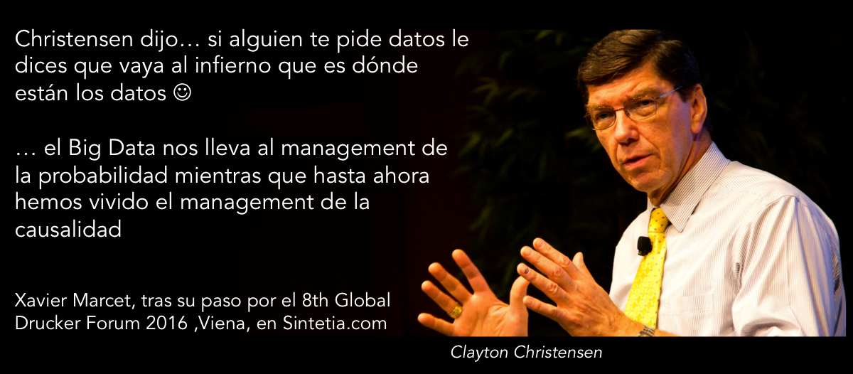 7.- Causalidad/Probabilidad. Uno de los factores de la complejidad viene aportado por la potencialidad del Big Data. Aquí se produjo uno de los momentos del Fórum, cuando Christensen dijo que los datos siempre mienten (no son la realidad) y que por tanto no podrían ir al cielo. Así, dijo Christensen, si alguien te pide datos le dices que vaya al infierno que es dónde están los datos. Más allá de la anécdota de Christensen y de las precauciones de Birkinshaw sobre Análisis – Parálisis, queda claro que el Big Data nos lleva al management de la probabilidad mientras que hasta ahora hemos vivido el management de la causalidad. ¿Era la causalidad la base de las burocracias y de las meritocracias y será la probabilidad la base de las Adhocracias?