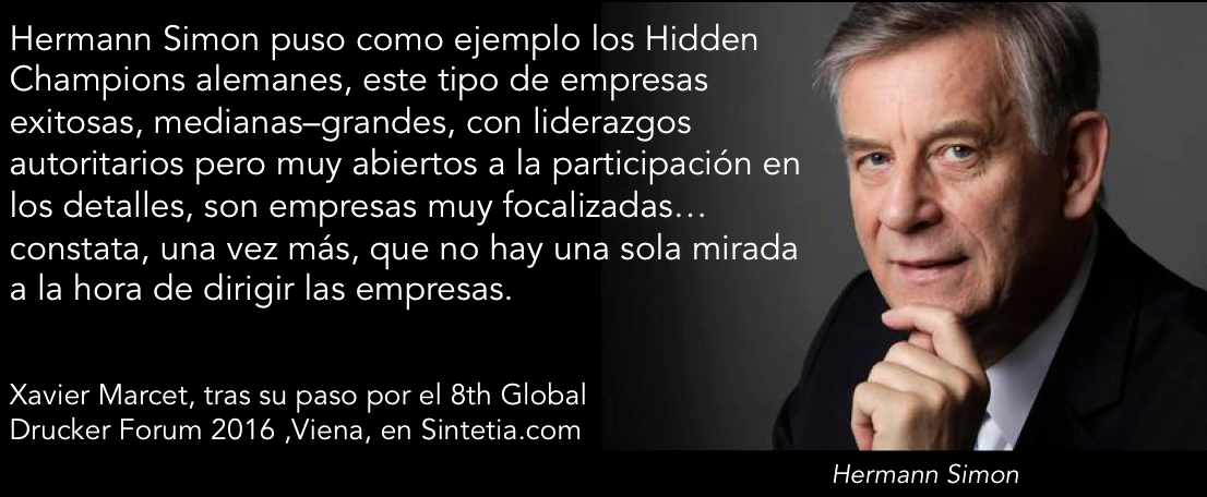 4.- Hidden Champions/Flat Army. El contrapunto a las empresas tendentes a la autogestión, postburocráticas, dónde los cambios van de abajo a arriba, como una “Flat Army” que combina bien la alineación a los objetivos y la empatía compartida, la pusieron los ejemplos de los Hidden Champions alemanes, este tipo de empresas exitosas, medianas–grandes, con liderazgos autoritarios pero muy abiertos a la participación en los detalles (Hermann Simon). Las Hidden Champions son empresas muy focalizadas. O el caso de un gran empresa como DMS que ha conseguido un índice de innovación superior al 20% aumentando sus márgenes en los nuevos productos y servicios. El debate es apasionante y constata, una vez más, que no hay una sola mirada a la hora de dirigir las empresas.
