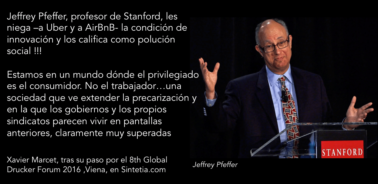 8.- Consumidor/Trabajador. Un debate muy interesante ha girado entorno a como modelos de negocio tipo Uber o AirBnB son enormemente interesantes desde el punto de vista del consumidor pero devastan las condiciones laborales y las de los proveedores (en este sentido son una extensión del efecto Wal-Mart). Gente como Jeffrey Pfeffer, profesor de Stanford, les niegan la condición de innovación y los califican como polución social !!! El debate no ha hecho más que empezar entorno a una sociedad que ve extender la precarización y en la que los gobiernos y los propios sindicatos parecen vivir en pantallas anteriores, claramente muy superadas. Se requiere un tipo de imaginación para gobernar que claramente no abunda, al contrario que los populismos que campan triunfantes. Estamos en un mundo dónde el privilegiado es el consumidor. No el trabajador. (Bad time to be a worker, good time to be a consumer).