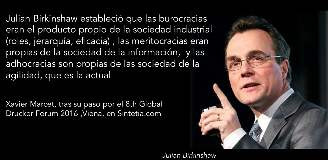 Tirando de este hilo, Julian Birkinshaw estableció que las burocracias eran el producto propio de la sociedad industrial (roles, jerarquía, eficacia) , las meritocracias eran propias de la sociedad de la información, y las adhocracias son propias de las sociedad de la agilidad, que es la actual. Las adhocracias no están tan centradas en conocimiento como las meritocracias, giran alrededor de la oportunidad, de la acción, de la experimentación.