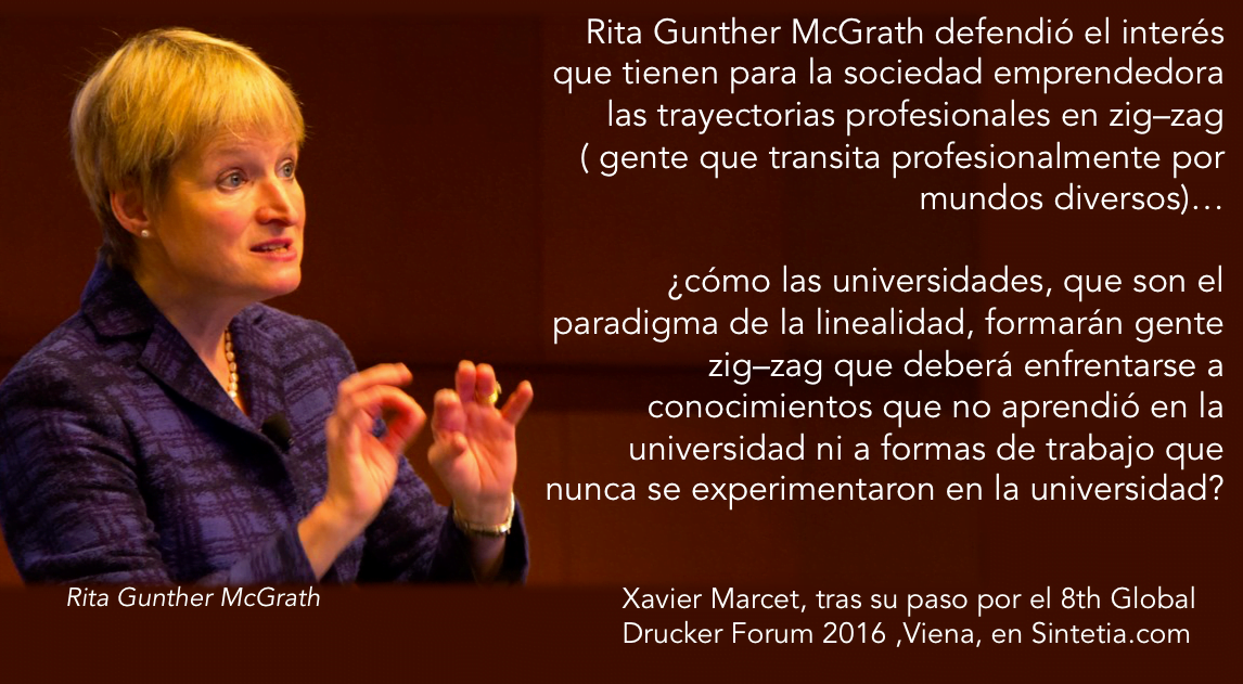 10.- Zig – Zag vs Lineal. GPDF16 ha sido muy inspirador y a uno siempre le sacuden inspiraciones laterales que, sin ser el centro del debate, son evocadoras. Cito dos. La primera es una reflexión de Rita Gunter McGrath sobre el interés que tienen para la sociedad emprendedora las trayectorias profesionales en zig–zag ( gente que transita profesionalmente por mundos diversos) y no solamente aquellos perfiles de carreras lineales y planificadas. Me pregunto cómo las universidades, que son el paradigma de la linealidad, formarán gente zig–zag que deberá enfrentarse a conocimientos que no aprendió en la universidad ni a formas de trabajo que nunca se experimentaron en la universidad. La segunda lateralidad es una cita: “A company without a story is a company without strategy” de Ben Horowitz (Una empresa sin relato es una empresa sin estrategia).